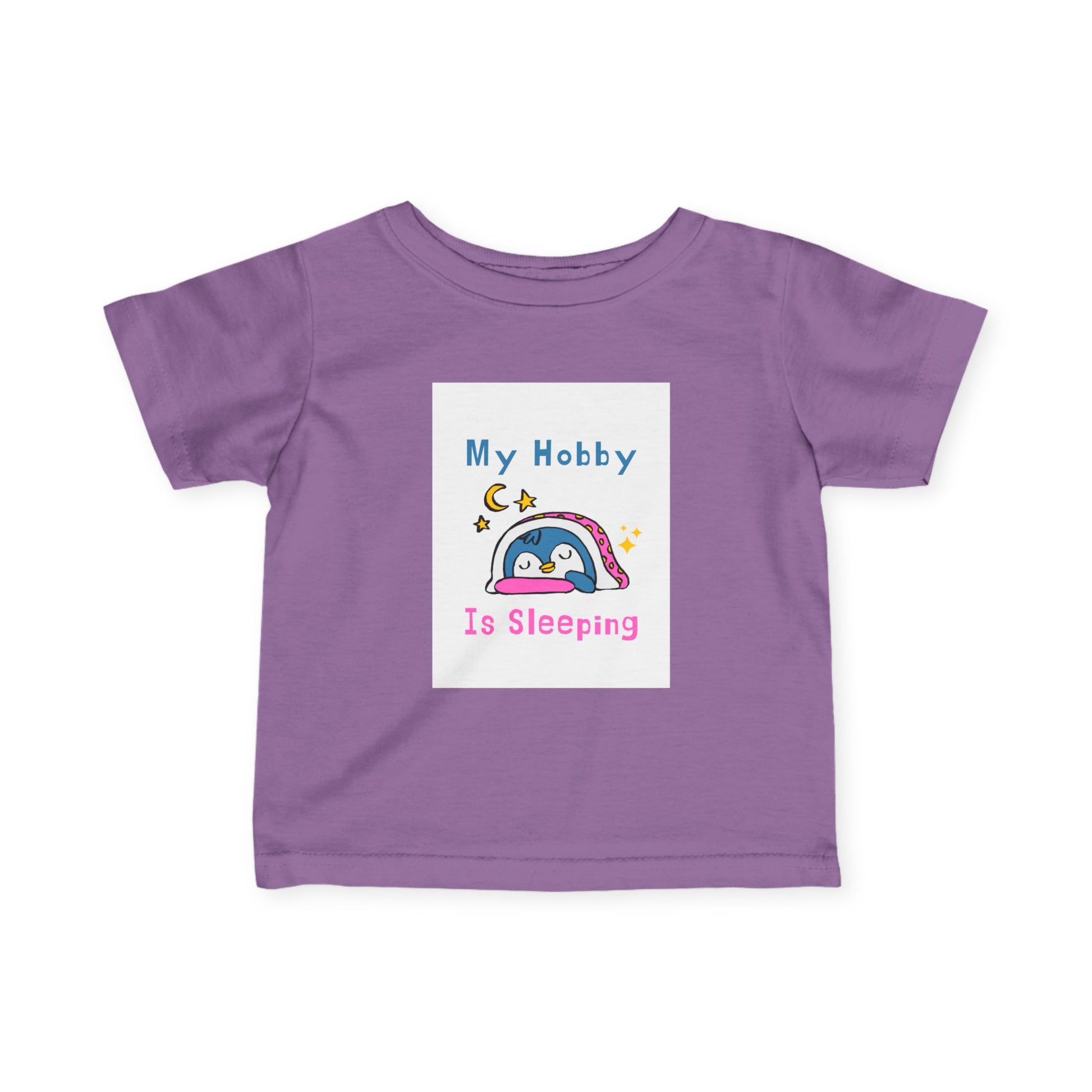 An adorable Infant Tee with a fun design that says 'my hobby is sleeping' on the front and 'girl power' on the back. Perfect for little ones who love to nap and exude girl power vibes. Ideal for babies and toddlers, and relevant for baby showers, birthdays, and everyday wear.